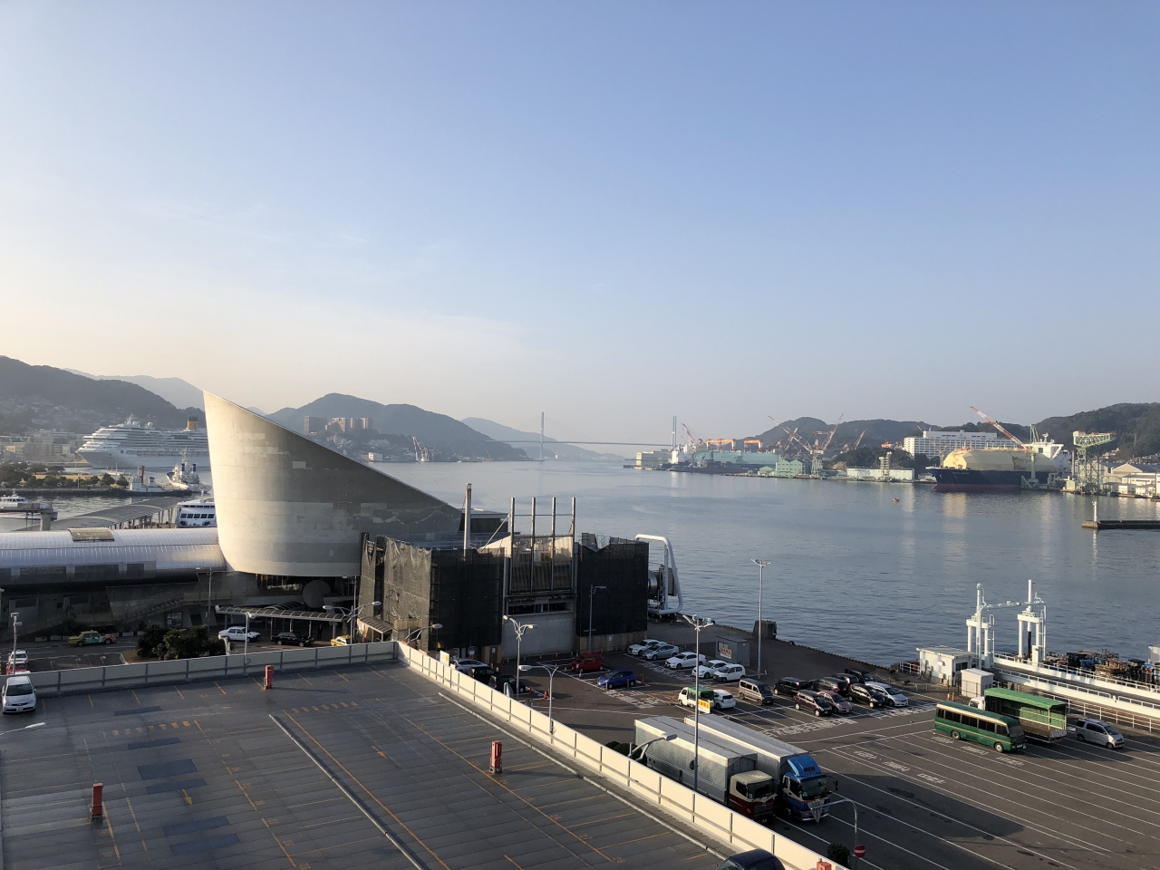 電停大波止の前はその名の通り長崎港ターミナルである。そこにオレンジ色の球がひときわ目立つビルのような?建物がある。近づいてみるとドラゴンプロムナードの文字が。なるほどウォーターフロントを眺めながら散歩ができる、これ幸いと階段を登って行くと、どんどん上に登る。長崎の人は階段が苦にならないようである。やっと上にたどり着くと、鉄骨がむき出しの板張りのプロムナードが続く。日曜の午前9時誰もいない。オレンジ色の球を目指すと、そこは展望台で対岸を含め長崎港が一望に。ここでやっとカメラを携えた人に会った。ショッピングセンター夢彩都につながっているが、10時開店で仕方なく階段で地上に降りた。