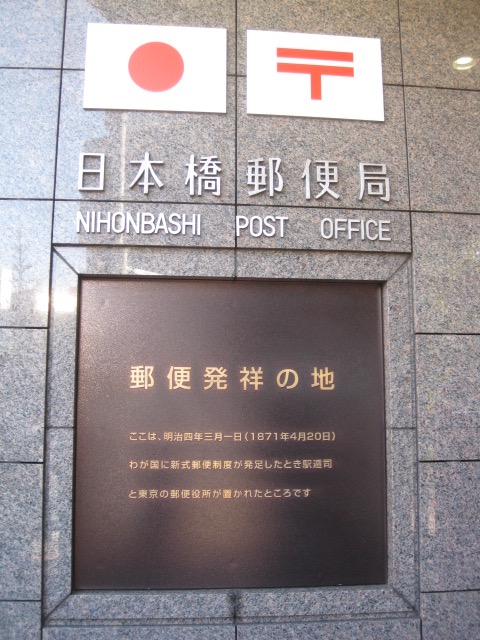 現在日本橋郵便局のある場所に、郵便発祥の地と書かれたプレートがあります。明治初期にそれまでの飛脚制度に代わり、近代的郵便制度が発足し、この場所が、駅逓司(郵政省)と東京郵便役所(郵便局)が置かれた場所だそうです。