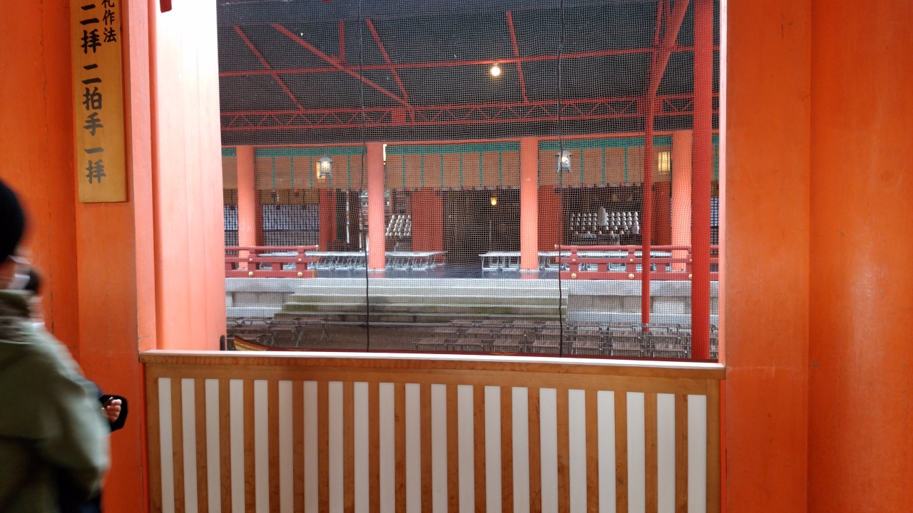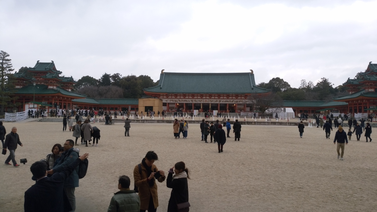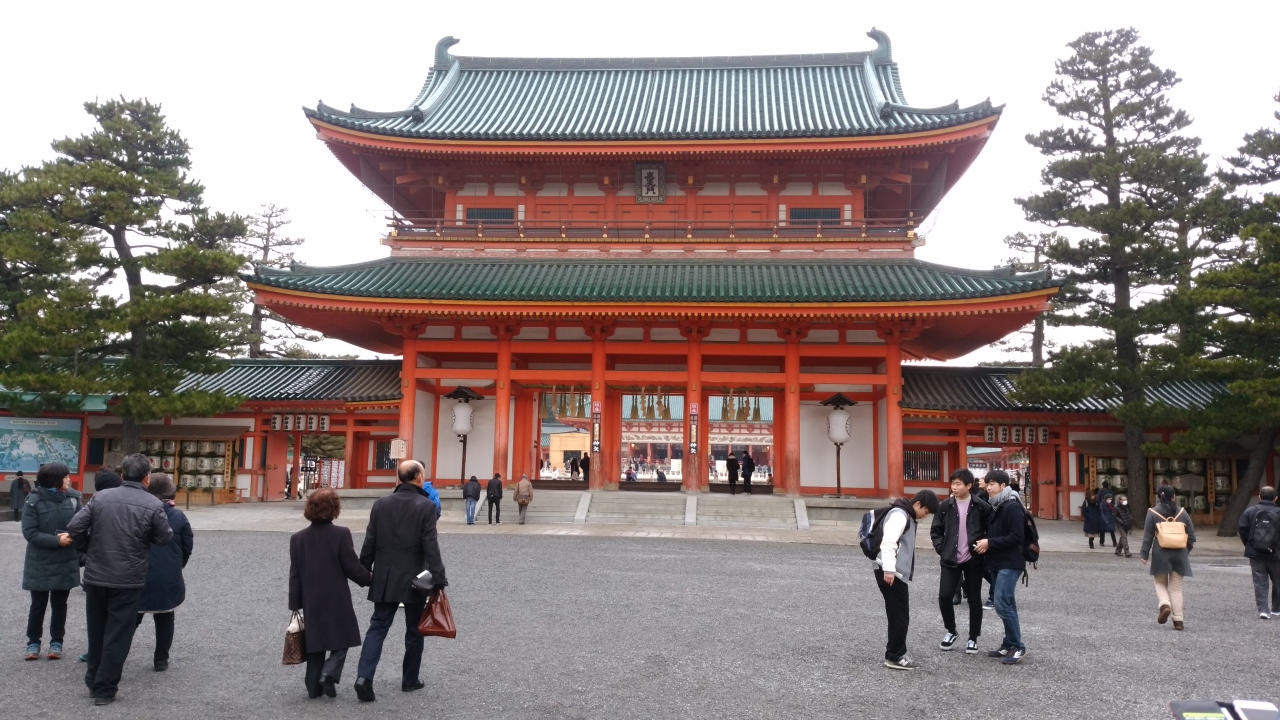 今回の旅行最後の地です。車は岡崎公園地下駐車場に停めて歩いて行きました。平安遷都1100年を記念して創建されたそうで、社殿は平安京の正庁を模しており、白砂に朱色の柱が映えていました。広大すぎて社殿の周りにも日本庭園や神苑があり桜や花菖蒲が季節を彩るそうですが、今回は時間がありませんでした。人出は少なくないと思われたのですが、何しろ広すぎて人は多くないように見えましたが、とても綺麗でした。