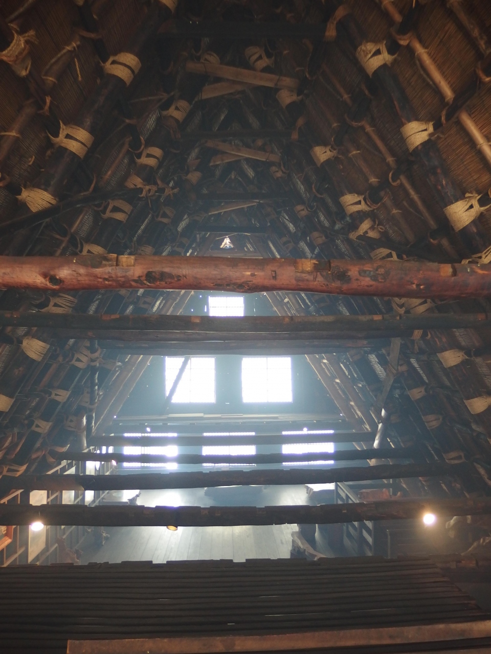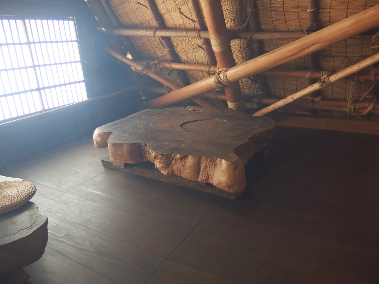 かなり規模の大きい合掌造りの民家ですが、自然木の美術館でもありました。入場料300円を払うとそれら美術品とともに合掌造りの内部構造を見学させてもらえます。ちょうど昔のように薪を燃やしておられたのですが、その煙が上部にあがってきて雰囲気が良かったです。