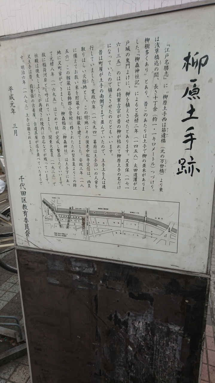 神田川に架かる和泉橋の南詰に柳原土手の説明板がありました。江戸時代に神田川の工事を行い、川の南側に土手を築いたそうです。今では土手が崩されてしまっているので面影はありませんが、江戸城の鬼門除けに太田道灌が柳を植えたことからこの名前が付きました。