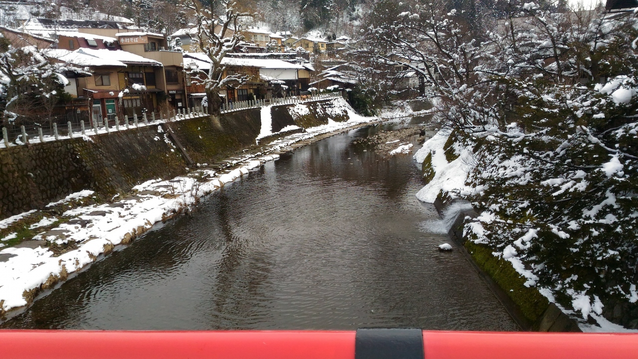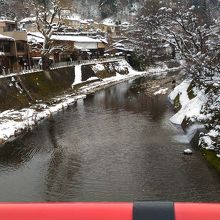 高山市内を南北に流れる川です。さんまち通りなど古い町並みは川を渡った東側の山側に建っています。浅い川ですが水はきれいで、雪の白さと古い町並みの茶色とのコントラストが良かったです。旧市街にかかるいくつかの橋の欄干は朱色に塗られ古都の雰囲気を醸していました。