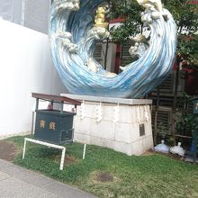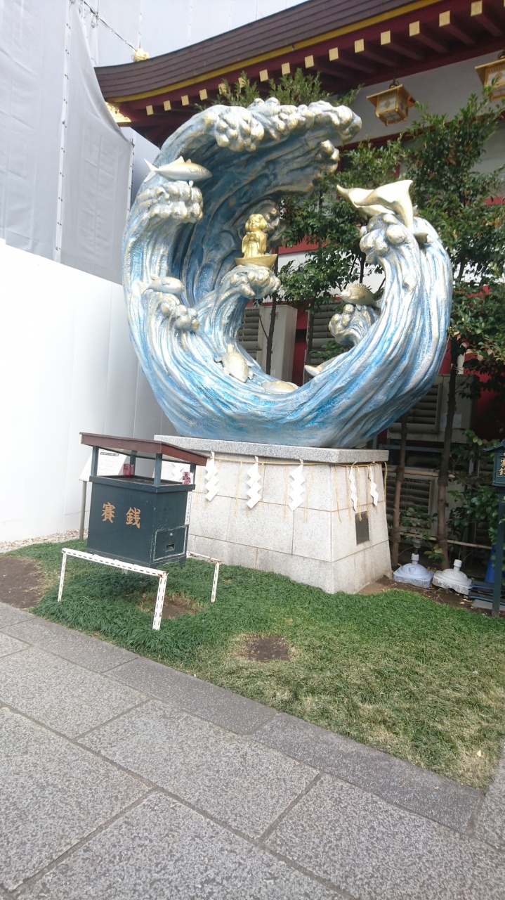神田明神の随神門を通って左側にえびす様のご尊像がありました。デザインがとても特徴的で、イルカやタイなど海の仲間に守られて大海原を渡るえびす様の姿が造形されていました。ちょっと奥まった場所にありますが、美しくて珍しい像ですので一見の価値があります。