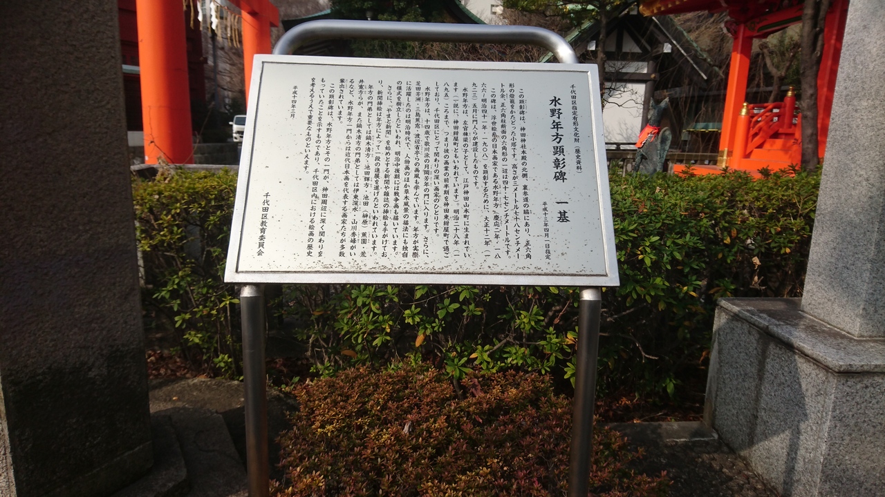 神田明神にたくさんある石碑の一つに、41歳で亡くなった浮世絵系の日本画家である水野年方を顕彰する石碑があります。高さは4m近くあり立派な顕彰碑ですが、誰にでも知られているような偉人ではないので、すごさがわかりませんでした。