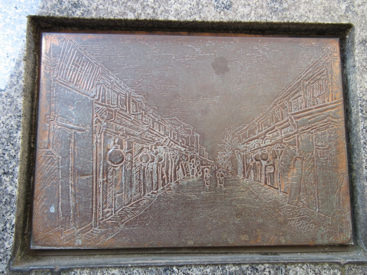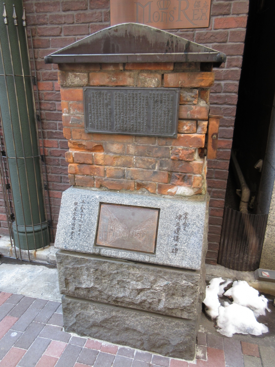 御門通りから金春通りに入ってすぐ、左側に煉瓦の一部が説明板と共に立っています。明治時代、煉瓦街だった銀座を偲ぶことができる碑です。当時はのべ一万メートルにわたって煉瓦街が形成されていたそうです。その時の様子が碑の下に描かれていて、ガス灯や提灯など趣ある様子を見ることができます。現在も煉瓦街が銀座の街に残っていたら楽しかっただろうと思いながら通り過ぎました。