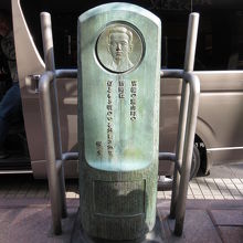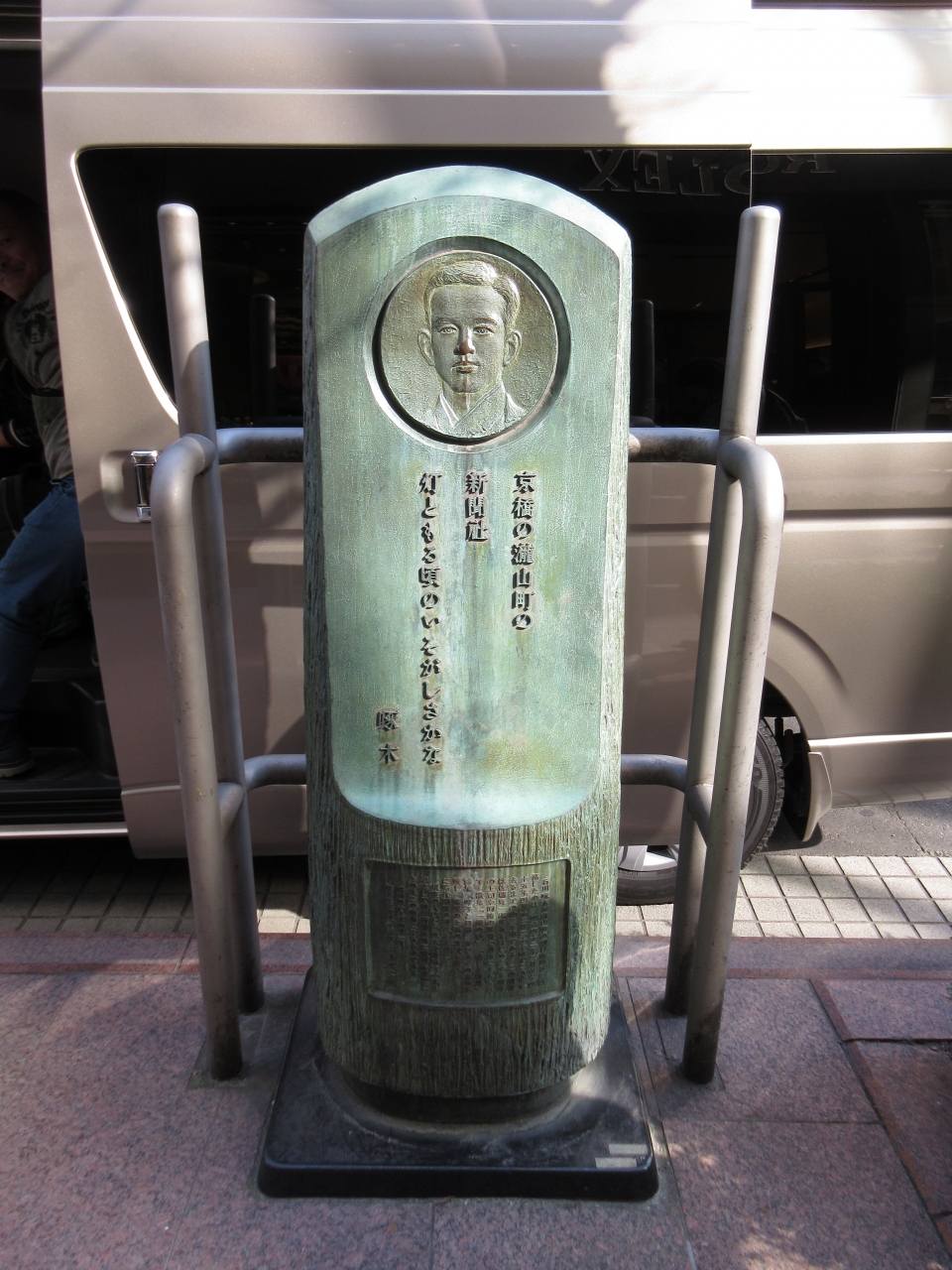 並木通り沿いに建つ、ロレックスが入っているビルの前の歩道に1.5mほどの碑が立っています。朝日新聞社に入社し多くの歌集や詩集を残したことから、啄木没後60年を記念して、新聞社跡地に立てられました。碑には啄木の顔と歌が刻まれています。26年という短い人生だったにもかかわらず、大きな功績を残した啄木に頭が下がります。