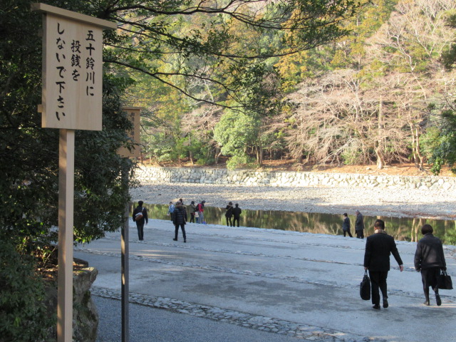 内宮では鳥居を通って宇治橋がありますがそこに流れる川が五十鈴川です。またしばらく歩くと右手に川辺に出れる場所もあります。お賽銭を投げる方がおられるのでしょうか、投銭しないでください、との看板も立っています。