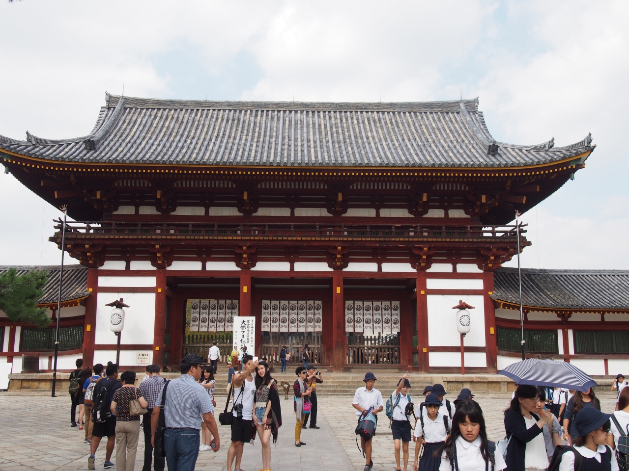 東大寺中門は東大寺の大仏殿のすぐ手前にある楼門です。左右に回廊が続いていて、奥の方では大仏殿とつながっています。中門は1716年に再建されたものです。立派な大きな楼門なので、こちらで撮影している人も多く見かけます。また、中門の素晴らしさを見ると、その奥にある大仏殿への期待感が高まります。