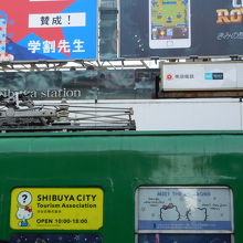 渋谷ハチ公のすぐ目の前に設置されている、緑色の旧東急電鉄の車両です。待ち合わせスポットとして利用している人が多く、いつも混雑している印象があります。海外からの観光客向けなのか、ハローキティだらけの装飾になっていて、不思議な感じがしました。