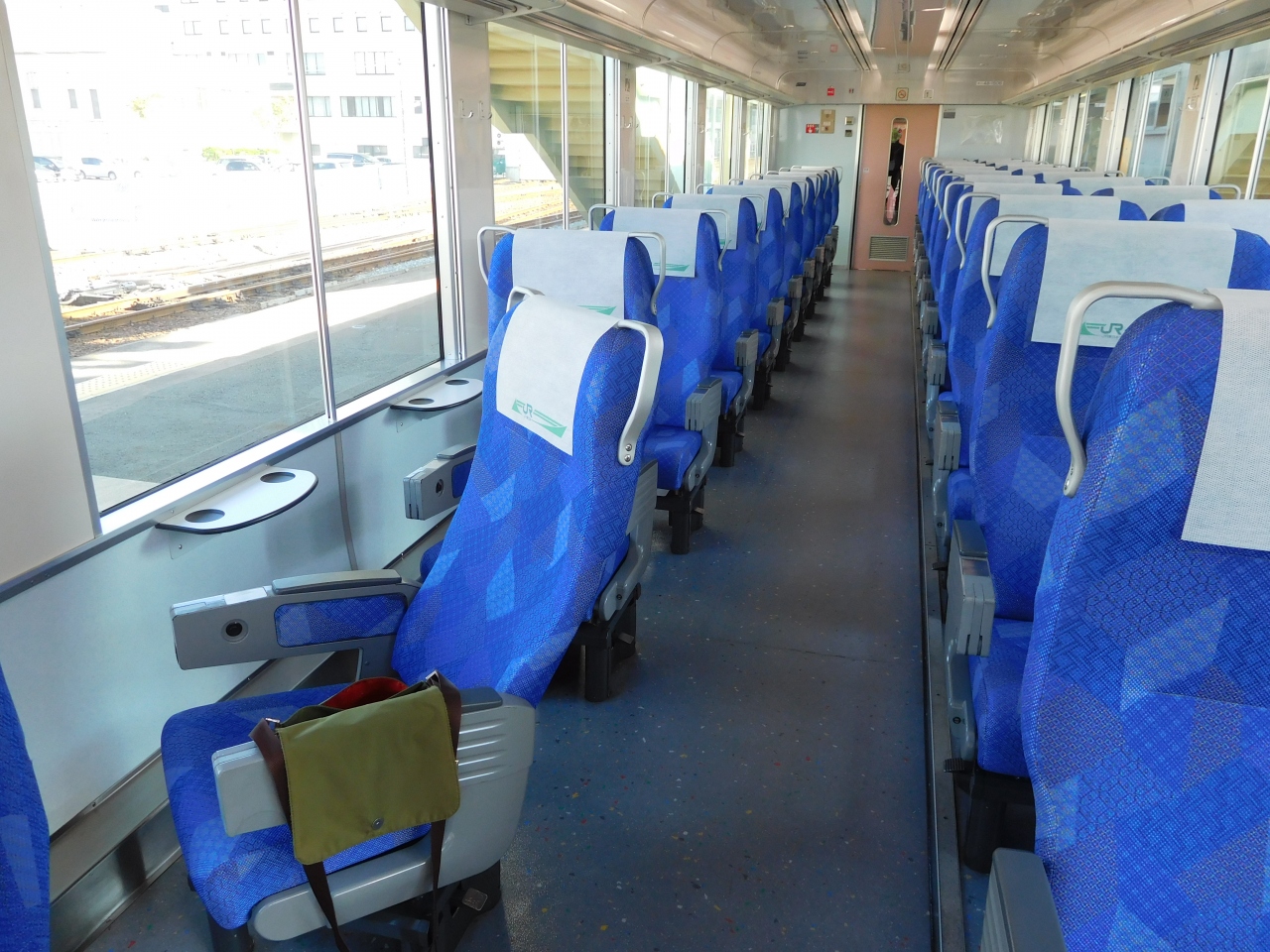 ここで裏ワザを紹介。帰りの久慈から八戸への1号車、ネットで調べたところでは指定席は売り切れていたはずなのですが、陸側席は幾つか空席がありました。たぶん、久慈駅改札に早く並んで、3号車自由席の海側席を確保したんだと思います。
