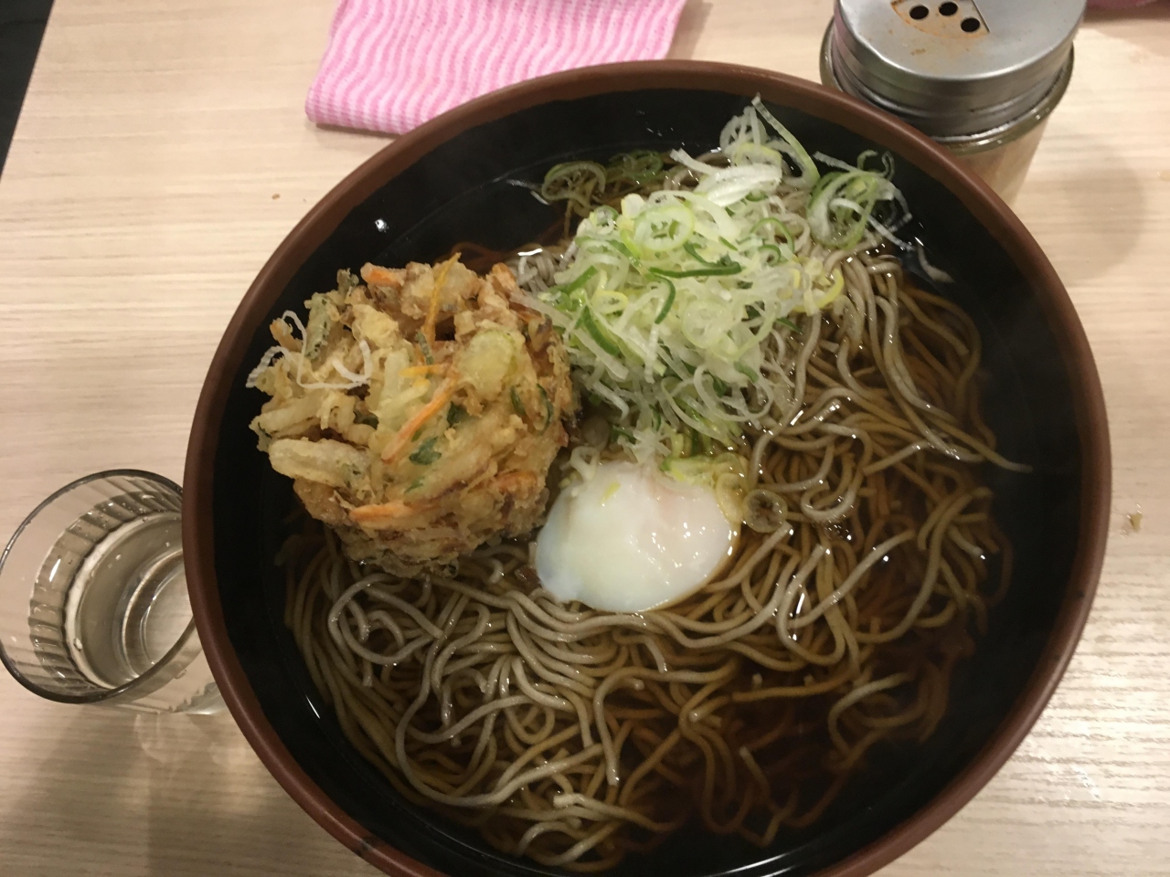 サクサクのかき揚げを汁に浸して楽しみます。麺も汁も駅の立ちそばとは思えないくらいレベル高いです。