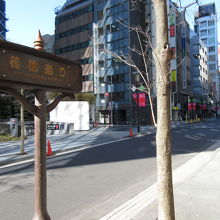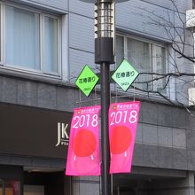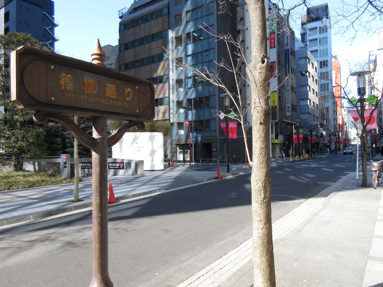 晴海通りに並行した通りの中で、新橋寄りの通りです。1993年に道路の改修が行われ、花椿通りと呼ばれ、出雲市から記念の出雲椿が寄贈されました。銀座東7丁目交差点入口に椿の木が植えられています。銀座コリドー通りまでホテルや有名店のビルが建ち並んでいます。街灯に通り名とスポンサー名がついていて、2018と鏡餅をモチーフとしたイラストが描かれている赤い旗が付いていて、新春らしい華やかな雰囲気を演出していました。この赤い旗が印象的でした。