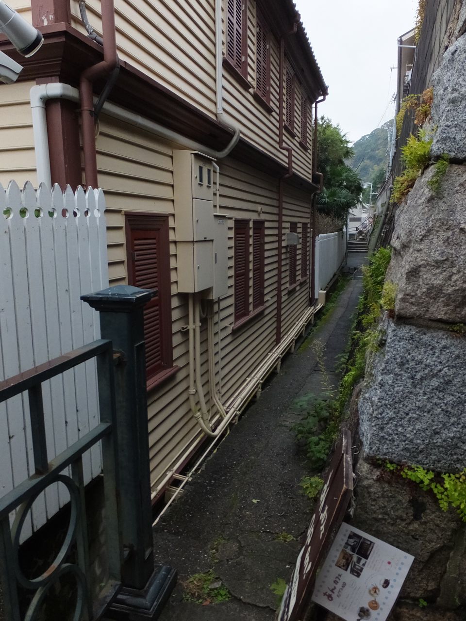 神戸の異人館街の異人館ではめずらしい公営のようで安価に入館できるのがいいのですが、耐震工事中で3年間の長期休館中。坂の上にあるおかげで大通りからはあまり見えませんが、坂道を登るとよく見えます。裏には細い通路があって壁に触れることもできます。やわらかなアイボリー色の下見張りの外板がきれいです。