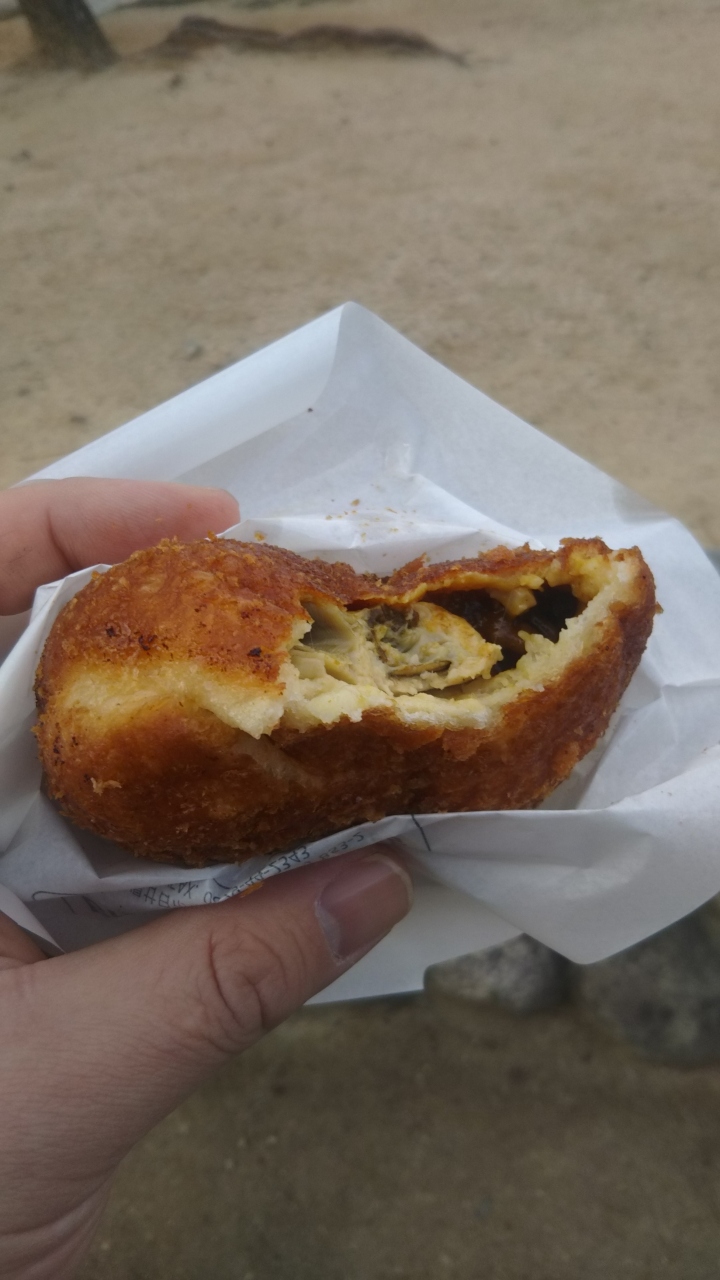 広島県廿日市市の宮島にあります。厳島神社の参道にあり、牡蠣が入ったカレーパンを食べました。カレーパンの中には大きな牡蠣が丸ごと入っていました。カレー風味と下記の風味が相まって大変おいしかったです。また食べたいと思いました。