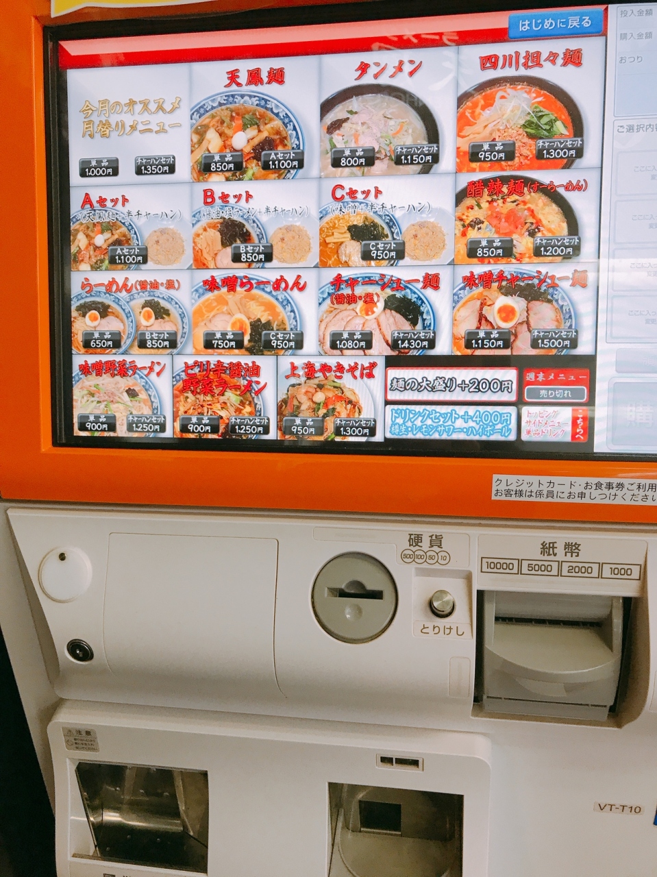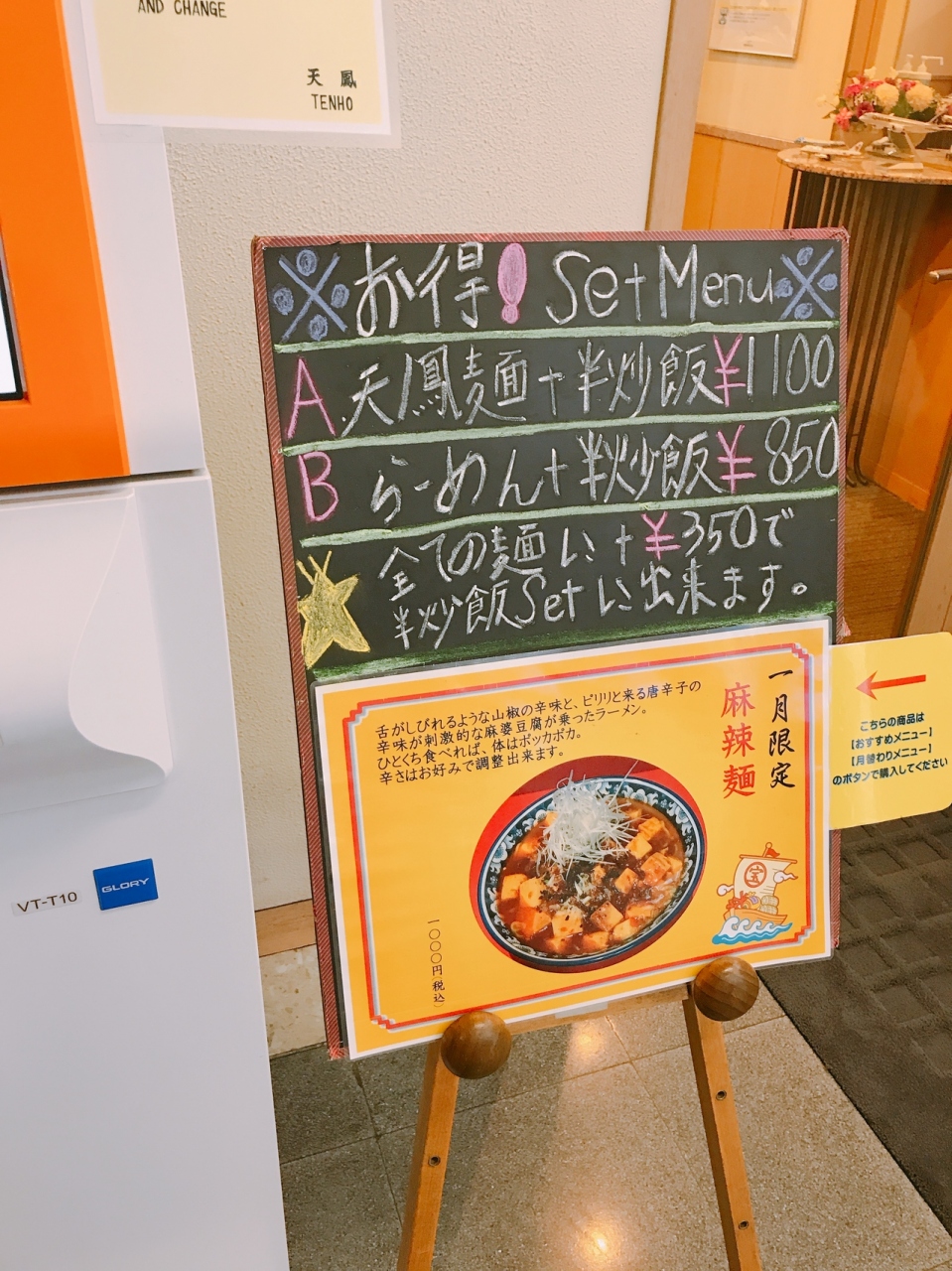 第一ターミナルの中央エレベーターを降りて左を見ると紀伊國屋がありその向こう遠くに赤いのぼりが見えてきます。そこが「天鳳」でした。券売機で選ぶと朝9時30分でしたが一人客がいました。「タンメン」を注文。野菜がたっぷり入っていて食べ応えがありました。スープは熱々で脂っこくなく最後まで味の濃さが変わりなく食べられました。