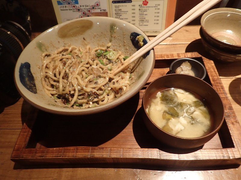 「まぜ麺」とは、何か? 食べてみて分かった。何種類かのタレ、生卵の黄身、刻みネギ、刻み海苔などがどんぶり入りの麺の上に載っていて、すべてまぜて食べるのだ。なかなかうまい。途中、テーブルに置いてある昆布酢、柚子コショウなどを少量加えて自分の味付けで食べるというお薦めも用意されている。どの味付けも美味しかった。麺を食べ終わると、どんぶりにタレが多く残ってしまったが、そこにも店の工夫があった。白いご飯を希望の量だけ無料で入れてくれるのだ。「追い飯」と名付けていた。漬け物、味噌汁もついていてお代わり自由だった。700円。大盛りもあり、プラス80円。