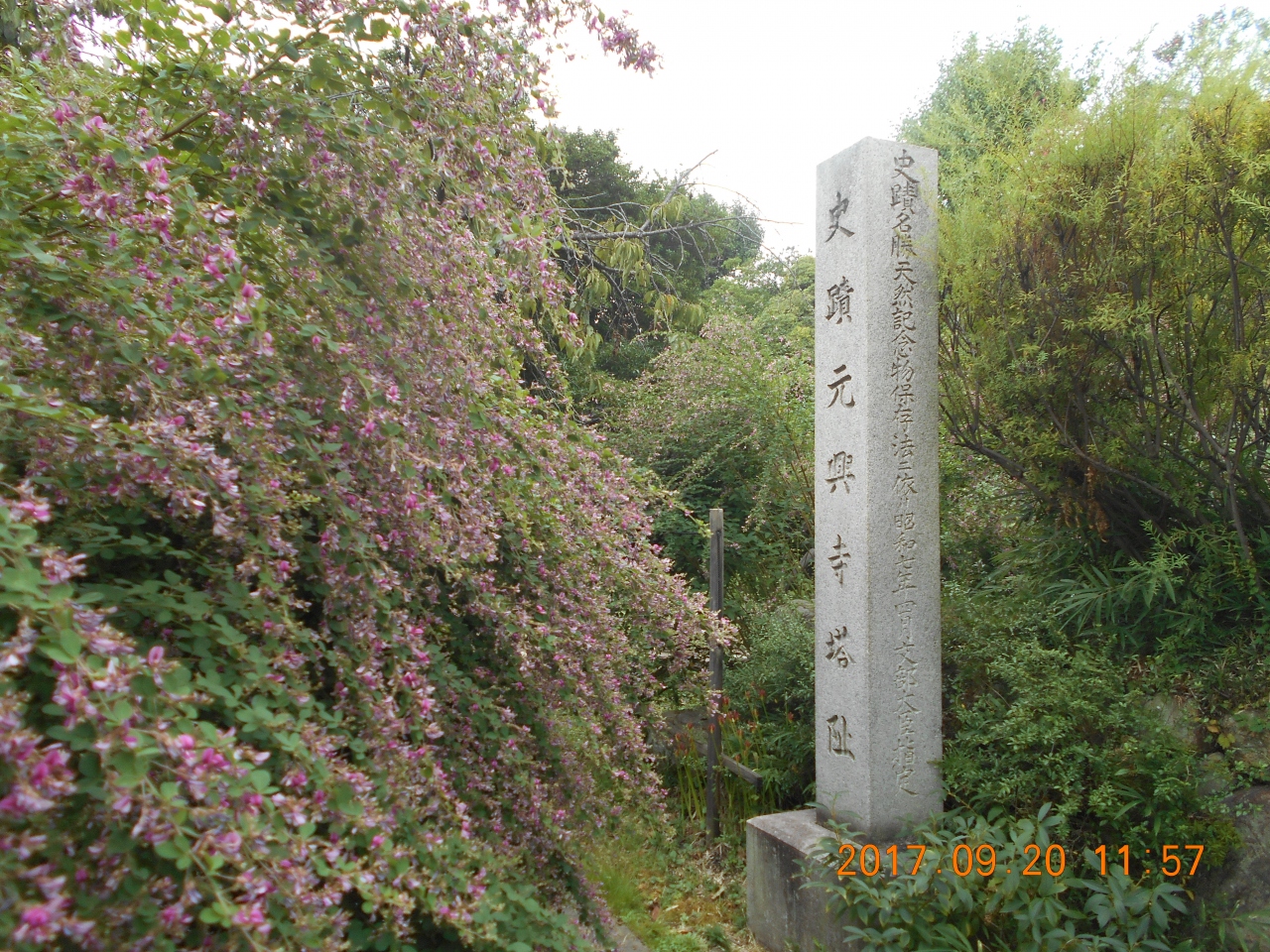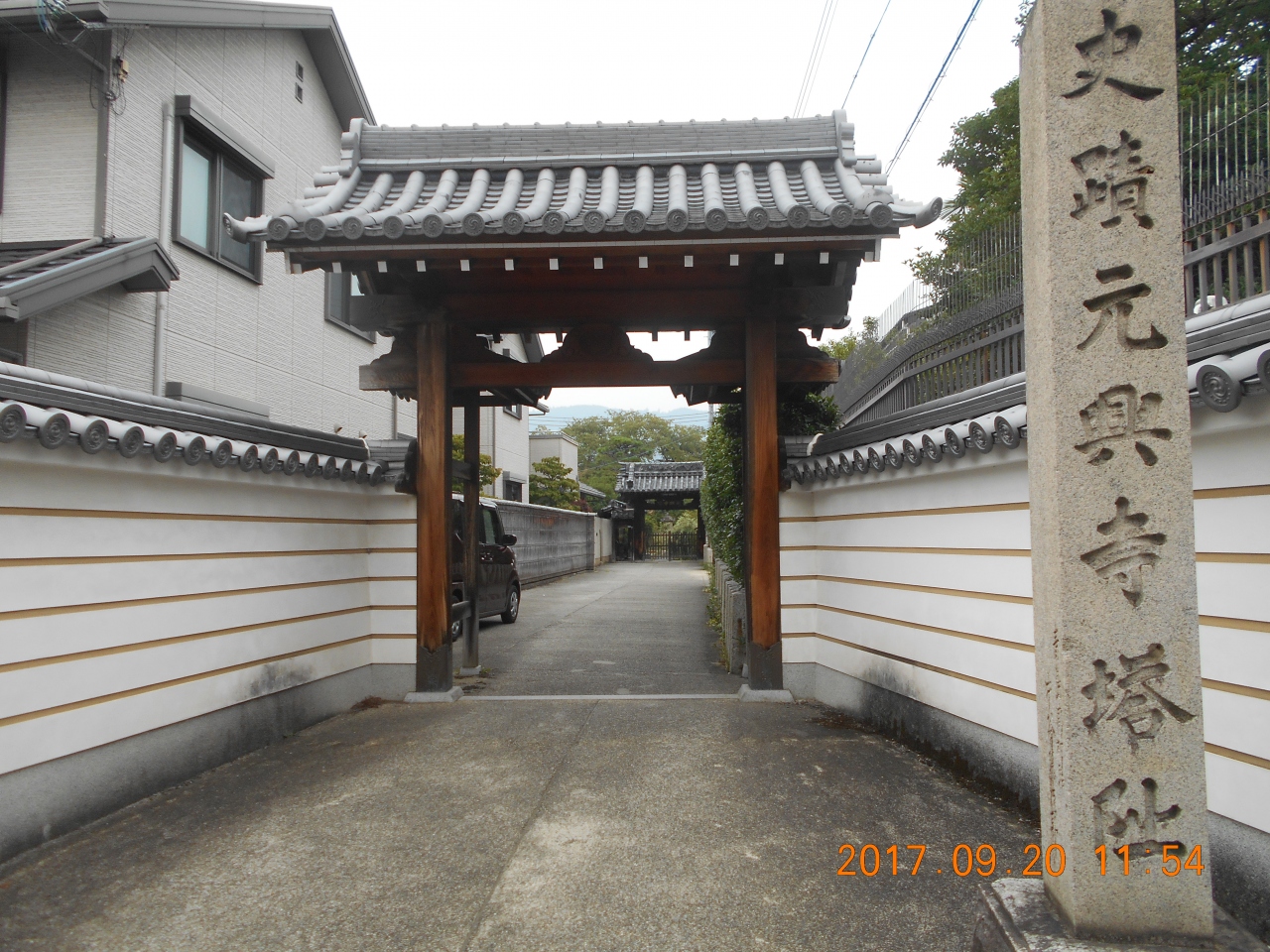 ならまちの落ち着いた通りからよく見えるところに 元興寺塔跡と書かれた石柱がたっていて その細い路地を進んでいくと 元興寺の山門があり 山門をくぐると内部はとても広くなっています。広い庭園の中にも元興寺塔跡の石柱があり 礎石が並んだ広い空間がありました。この空間に塔が立っていたのだという感慨深い思いを感じたひと時でした。