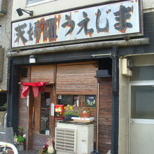 昔の東海道の宿場町の品川宿。今で言う北品川の辺り。こちらにある老舗の天麩羅屋さんがうえじまさん。年季の入った屋号の看板がなんだかノスタルジー。