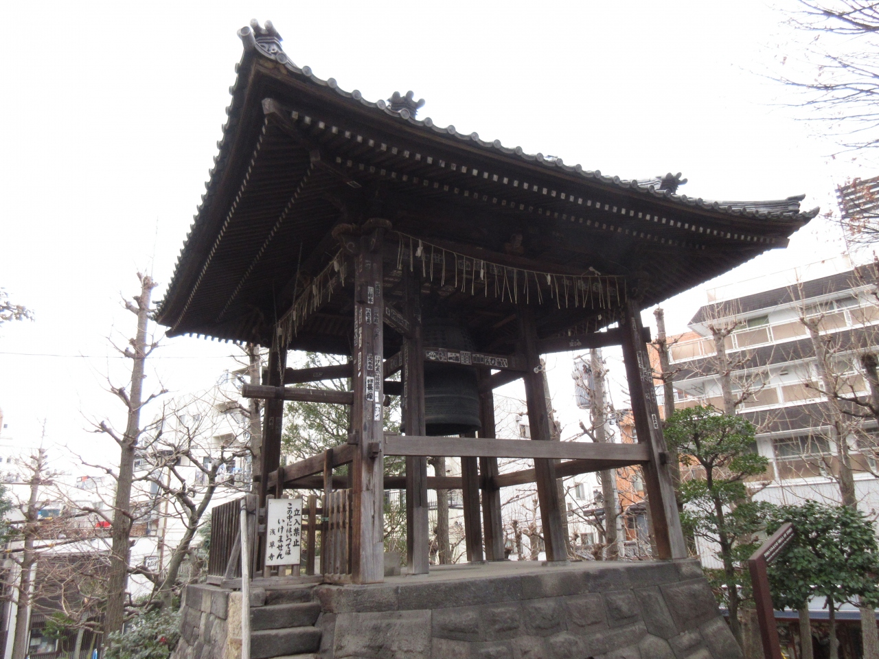 仲見世と並行している裏通り沿いにある小高い丘に鐘楼が建っています。鐘楼の中にかけられている鐘は300年以上の歴史があり、江戸時代に江戸の町に時を知らせていたものです。現在も毎年大晦日と毎朝6時に撞かれ時を知らせています。江戸時代は建物も低く数も多くなかったと思われるので、遠くまで音色が響き渡ったと思います。裏道にあるため訪れる人は少なく周辺は静かなので、休憩がてら訪れてみてはどうでしょうか。