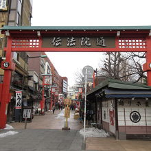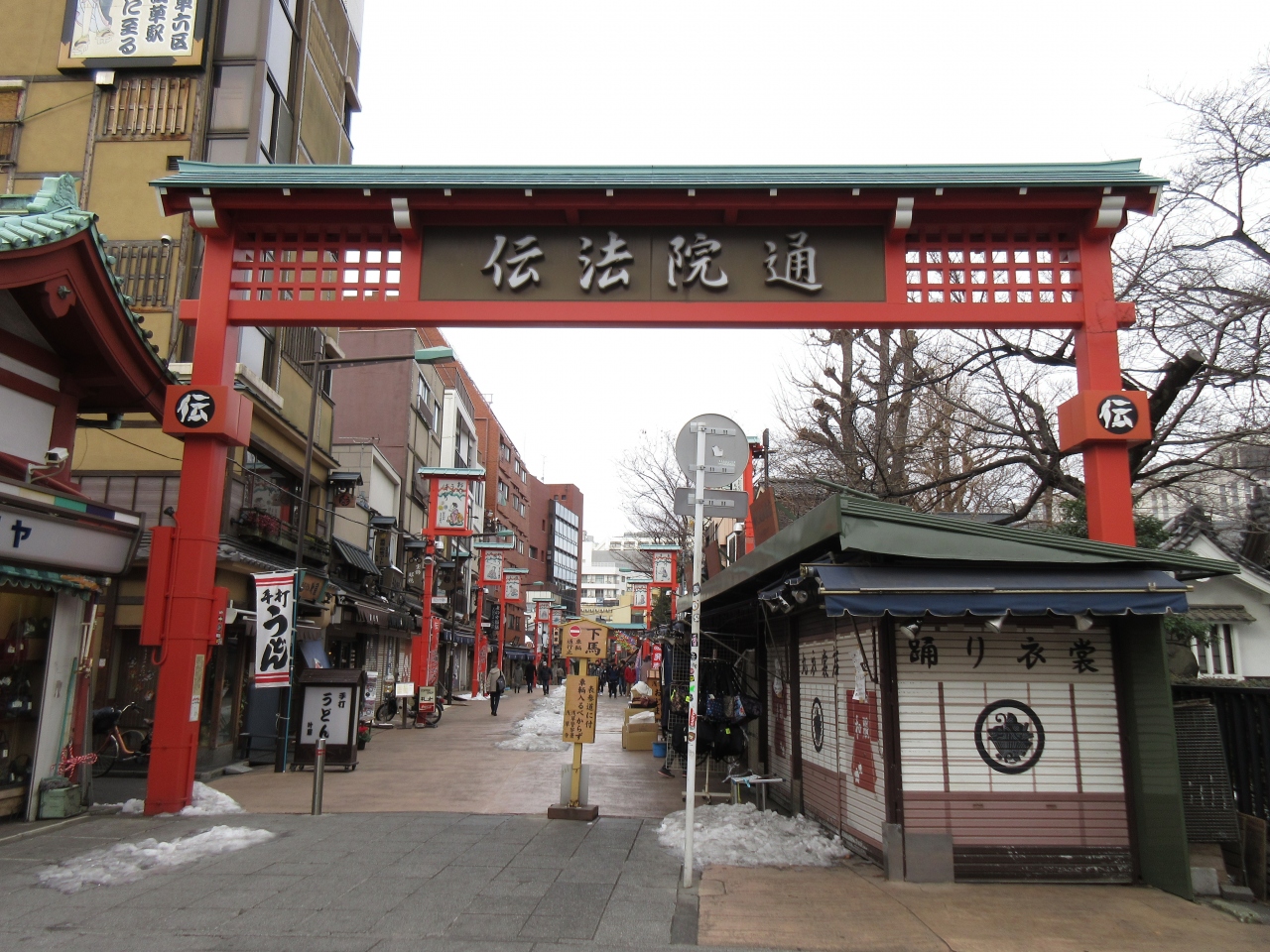 仲見世と交わり、伝法院沿いに造られた昔からある通りです。道の両側には飲食店や土産物屋、衣料品店などが並んでいます。店が開く前に通りかかったところ、店のシャッターには江戸を表す絵が描かれ、外国人も興味を持って眺めていました。通りの両側に立つ柱の上には、日本のことわざをもじったダジャレとイラストが描かれていました。1つ1つ読んでいくと笑ってしまう作品ばかりでした。スカイツリーも眺められ、日本の新旧を見ることができる通りだと思います。