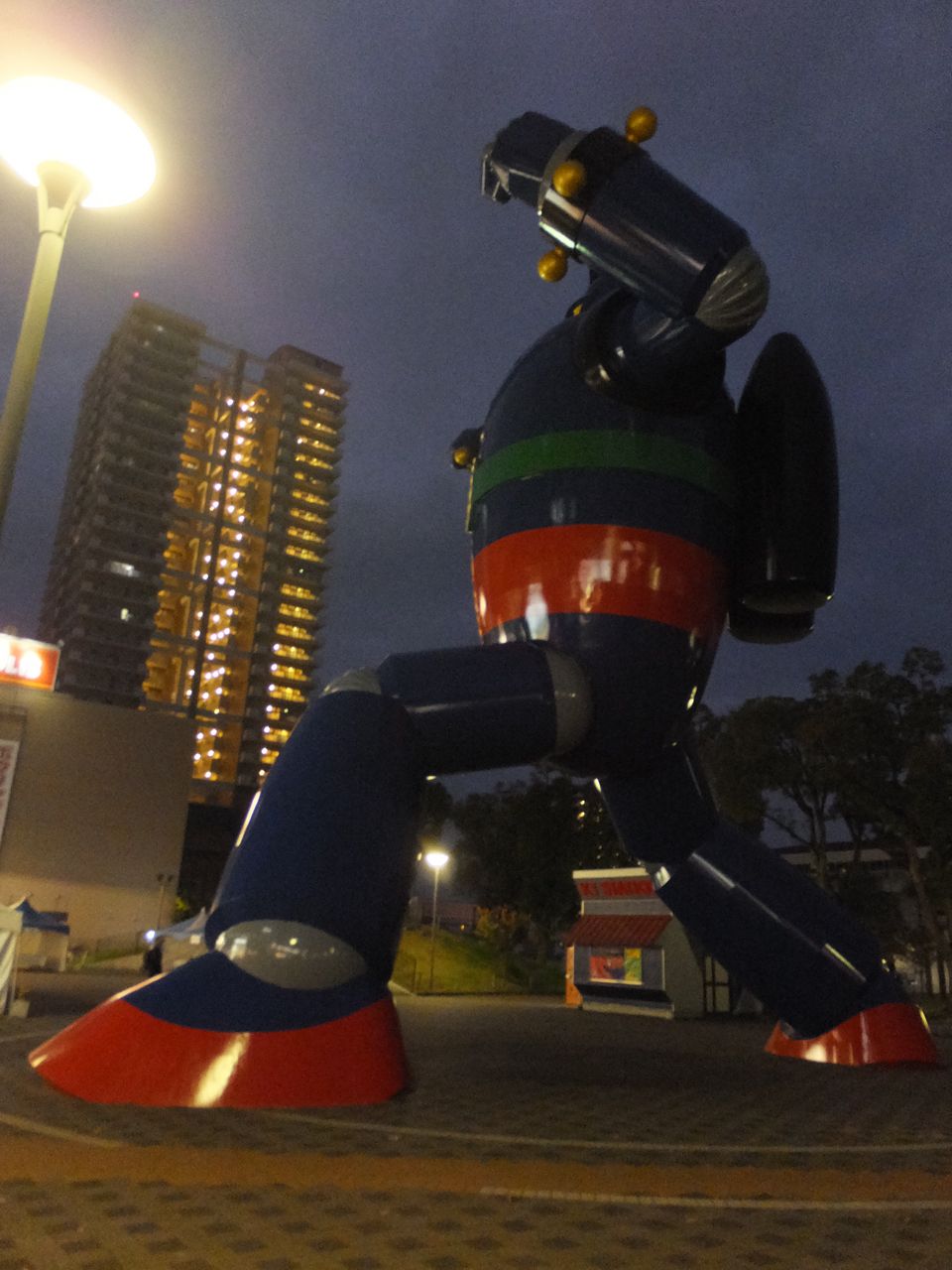 神戸復興のシンボルともいえる鉄人28号。そのモニュメントを訪ねるため新長田駅で降りたのですが、駅前の地図・案内板にも案内はなく、矢印などもなくどこにあるのかさっぱりわかりません。商店街に鉄人28号の顔の板が見えたのでそっちだろうと行くと、ありました。駅の南口を出て右側のビルの中を通り抜ければすぐだったのを遠回りしてしまいました。場所としては駅の南の西に向かった線路沿いです。