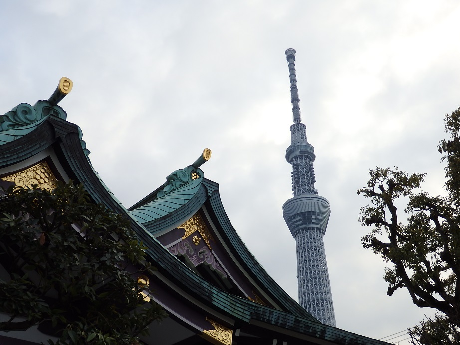 境内の端からはスカイツリーのてっぺんも見ることができます。撮影スポットに足跡のマークがつけられているのが親切^^