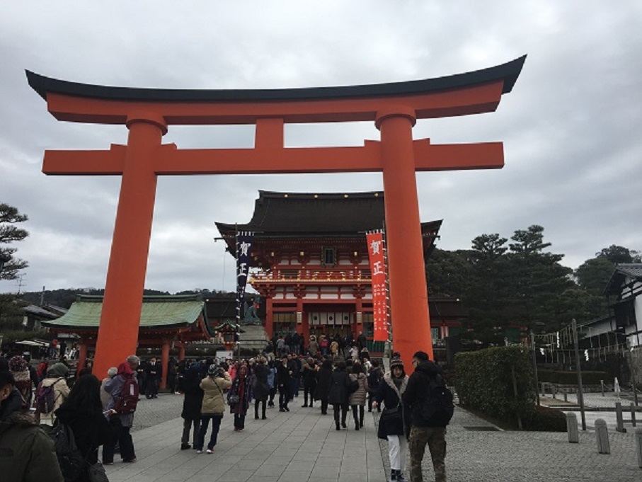 伏見稲荷大社へのアクセスはJRが一番便利です。稲荷駅を降りると目の前に鳥居が見えその先に楼門があります。それだけにここ駅前では回りを見ていない中国人観光客が交差点に場所取りしています。