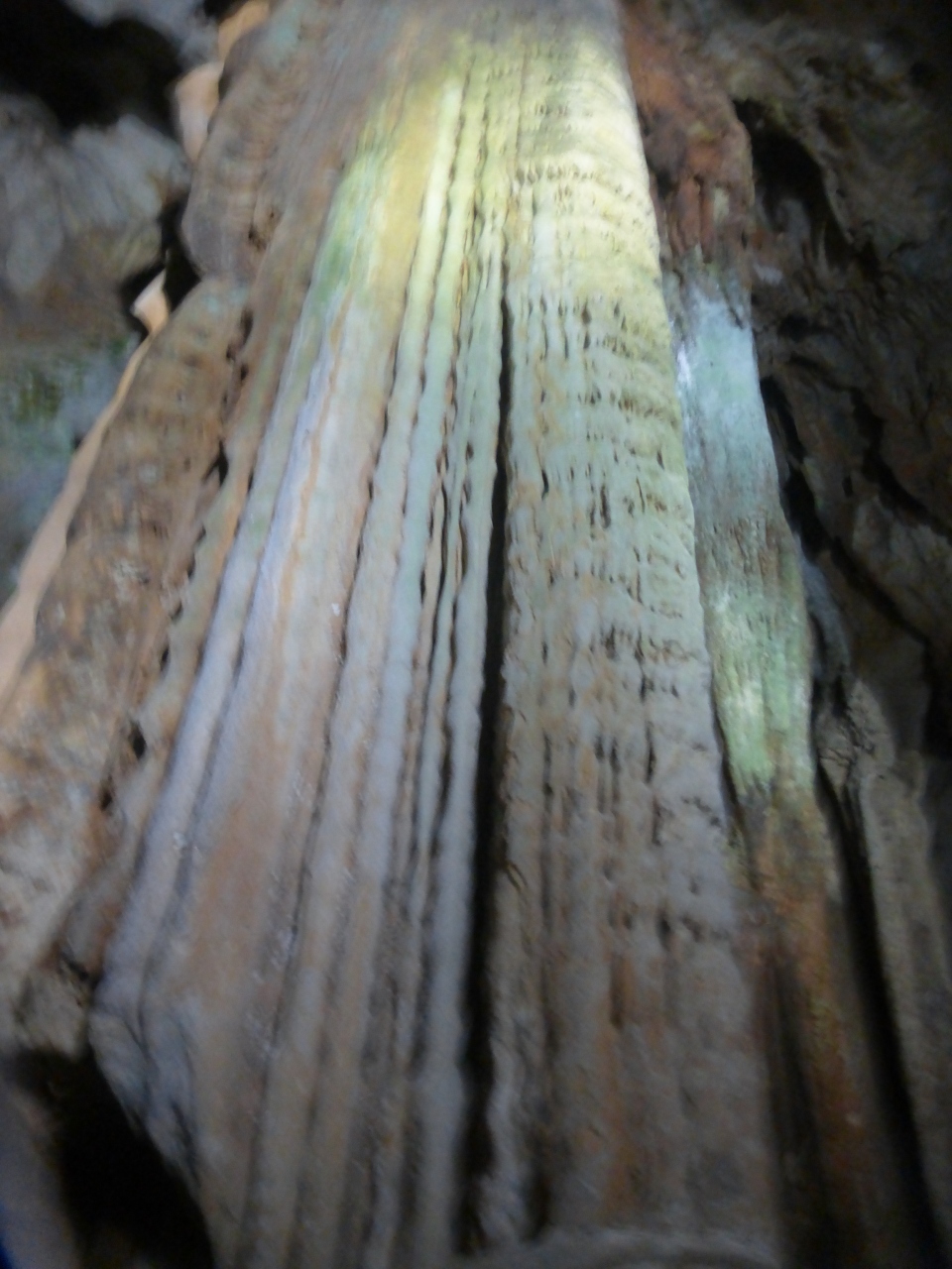 秋芳洞の中の見所のスポットのひとつ。岩の壁を流れる水が成長した鍾乳石で高さが結構ある。鍾乳洞の中で柱のようにどーんとかまえているようでなかなかの見ごたえ。
