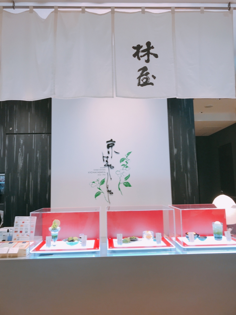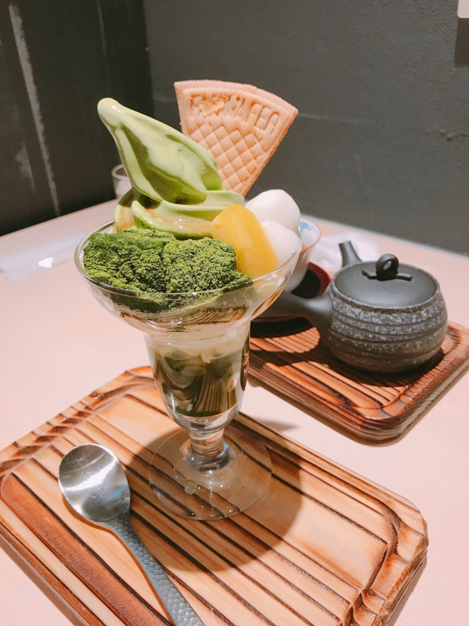 「わらび餅パフェ」と「わらび餅と葛ねり」を注文しました。セットのお茶が先に出てきてお湯の入ったポットも運ばれてきました。