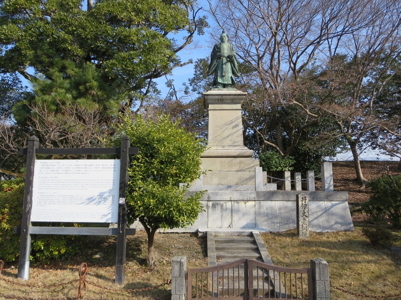 彦根城佐和口近くにある井伊大老の歌碑や、青年時代に厳しく刻苦勉励していた埋木舎を見てきたので、晩年の大老となった姿を見たい思っていました。金亀公園から探していて、楽々園、玄宮園を過ぎて金亀児童公園にあるのを見つけました。暗殺で命を落としたので、分かりにくい所にあるのだろうかと勘繰ってしまいました。