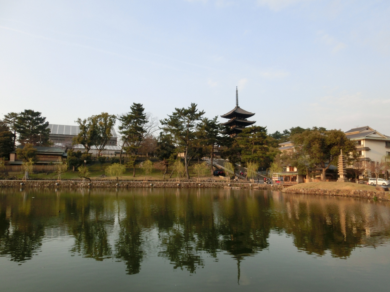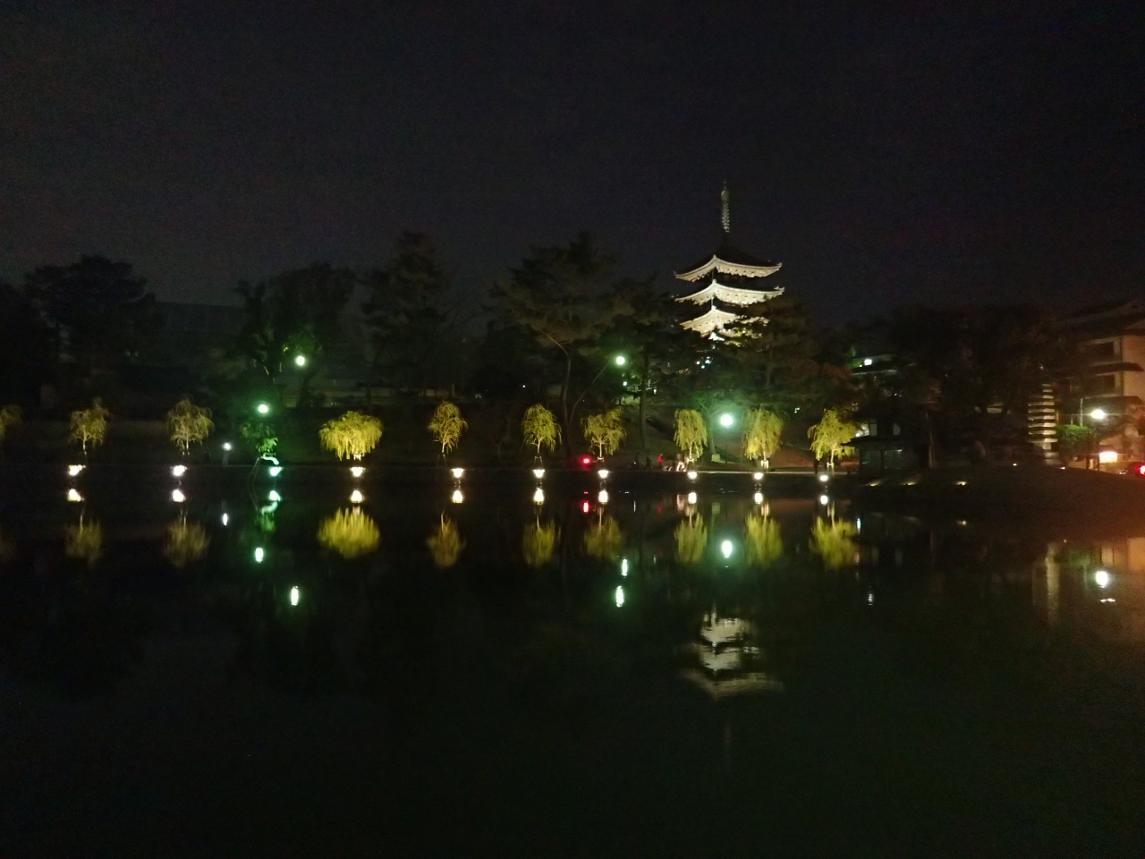 猿沢池の周りには、五重塔などの有名な建築物があります。その建物が池に映りこみ、とてもすてきな景色を見せてくれます。夜間も、周りのライトアップされた建物が池に映りこみ、なんとも幻想的な雰囲気になります。