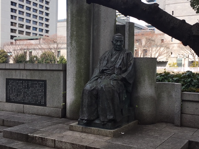 淀屋橋の交差点から土佐堀川沿いの西側に何か見えたので、通りを渡って行ってみると、淀屋屋敷跡でした。その横に何か銅像みたいなものが見えたので行ってみると、この林市蔵像でした。林市蔵は元大阪府知事だそうですが、それよりも民生委員制度を作った民生委員の父して有名な方だそうです。この銅像を見るまでは知りませんでした。椅子に座って、遠くを見つめている姿の銅像です。