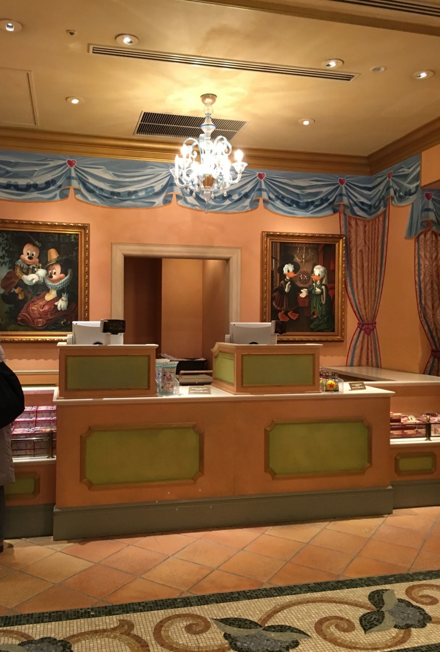 メディテレンニアハーバーにあるお菓子を中心にしたショップです。お店の壁にはルーベンスの画家とその妻イザベラブラントの絵画に扮したミッキーとミニーの絵や、アルノルフィーニ夫妻像に扮したドナルドとデイジーの絵が飾られていてとても素敵です。バレンタインの商品もたくさんありました。