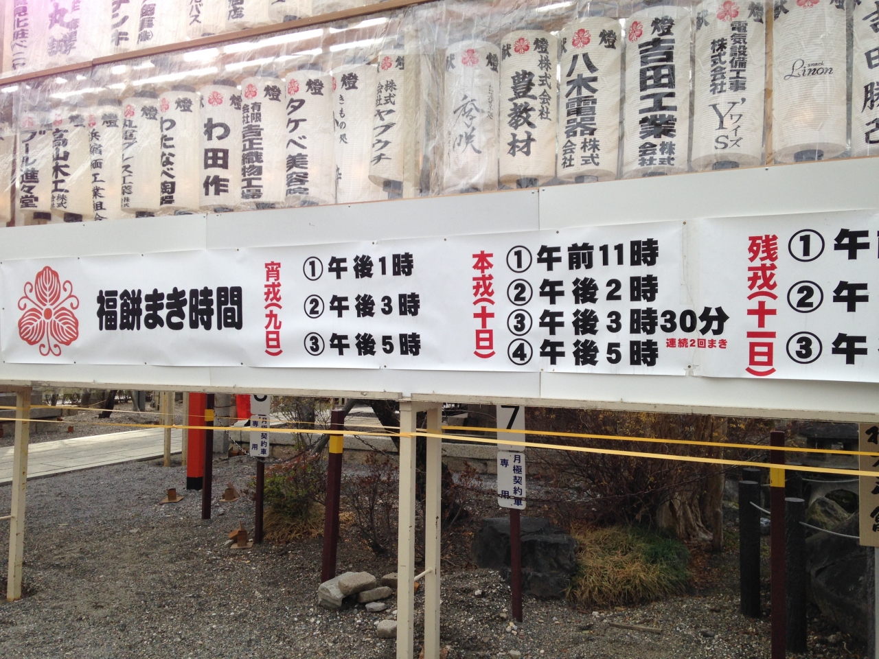 ちょうど行った時に行われており、屋台がたくさん出ておりにぎわっていました。地元の方が商売繁盛の熊手の様なささのおかざりを買っていました。期間中に1日に3~4回餅投げが行われる時間があり、大賑わいでした。無料の甘酒もいただけました。
