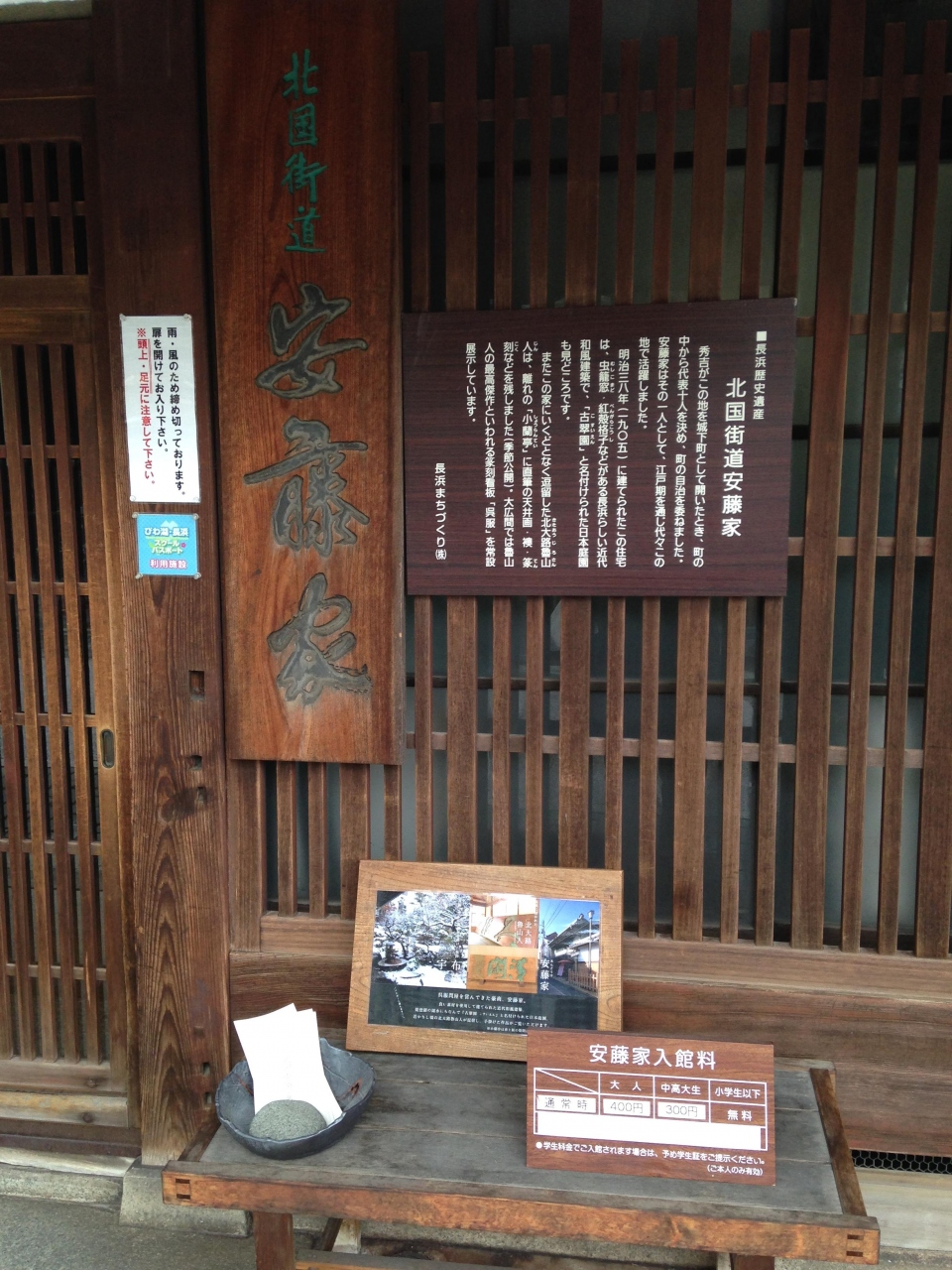 北国街道にある旧家で開知学校と黒壁ガラス館の間にあります。入館料は400円で建物と中庭を見ることができます。またこの屋敷によく来ていた北大路魯山人が書いた呉服の看板も展示されています。110年ほど前に建てられた屋敷です。