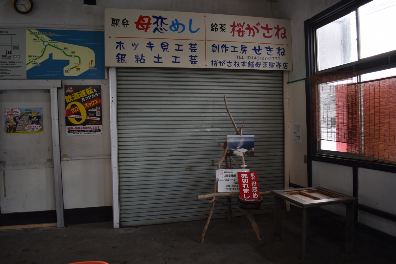 母恋めしを買おうと母恋駅売店へ行ったら「売り切れ」の札が掛けられ、