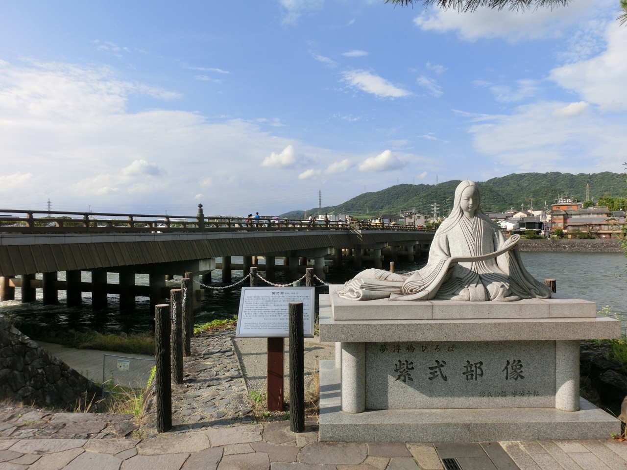 平等院拝観を終え表門から出ると両側に宇治茶のお店等が並ぶ雰囲気ある門前町参道となります。参道は短く5分程で橋のたもとに出ます。宇治川にかかる宇治橋です。紫式部の石像があります。源氏物語にも登場する由緒ある橋でそう想って眺めると欄干や橋脚に風情を感じます。宇治川は思った以上に速い流れです。宇治橋から平等院の南門の駐車場に戻る宇治川沿いの路は木陰の気持ちよい散策路で、途中、鵜飼を催す場所も通ります。平等院拝観の前後に宇治橋を中心に散策することをお勧めします。