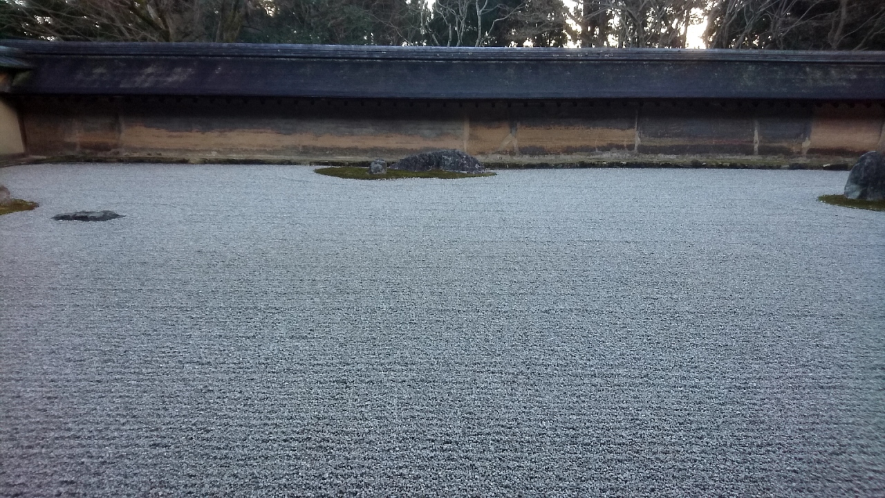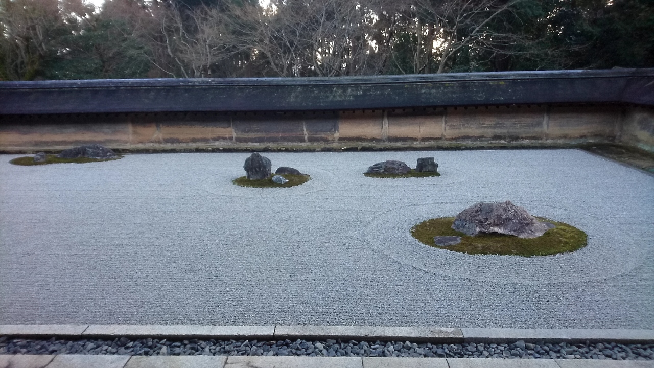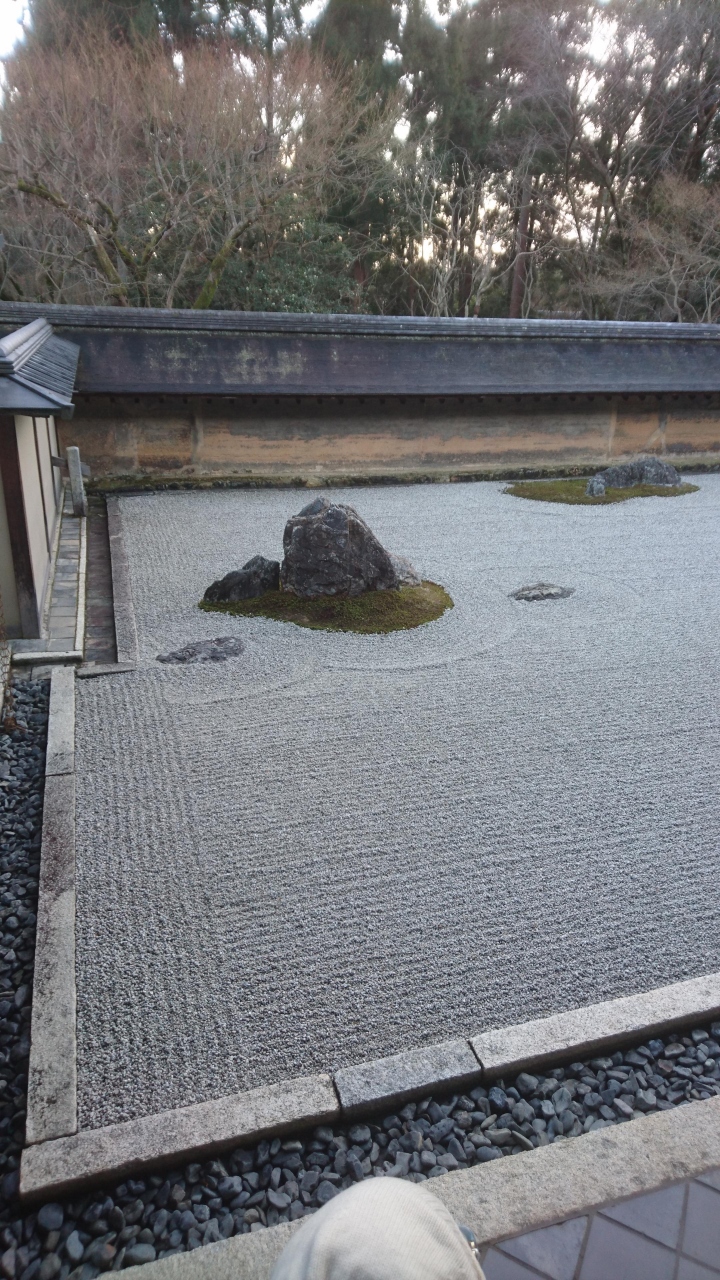 正月の三が日に世界遺産の龍安寺に行きました。龍安寺にある石庭を見に行くためです。境内に入って石庭を見るとう美しい模様で表現された石庭にとても魅了しました。縁側に座って見ても見事な美しさでしばらくはずっと座っていました。一度でもいいから龍安寺の石庭を見たかったのでとても印象に残りました。