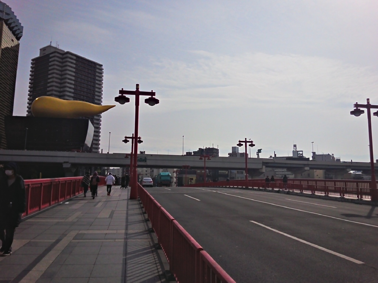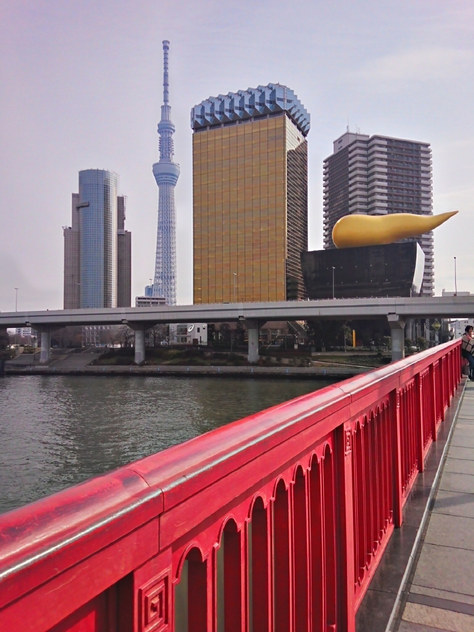 雷門から一番近い橋です。橋の西詰には観光船乗り場も在り、スカイツリーやアサヒビールのビルなどと赤い橋を写そうとする観光客でいつも混み合っています。確かに写真撮影には持って来いの橋です。