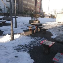 小川町駅の近くにある広場で有料によるフットサルコートもありました。東京で大雪が降った後でしたが、ビル街の中にあって日中の日差しが入りにくいせいか、1週間たってもたくさんの雪が残っていました。最終的な利用方法が決まらず、暫定的に広場として利用されているため、「公園」ではなく「広場」となっています。