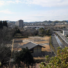 駿河国志太郡の奈良・平安時代の役所(郡衙)跡です。別名御子ヶ谷(みこがや)遺跡。昭和52年に団地造成のための発掘調査で発見され、石敷道路や掘立柱建物の跡、板塀、井戸などが出てきました。墨書土器の文字によって裏付けられた例は学術的にも大変貴重だそうで、国指定史跡となっています。平面や柱穴の規模をもとに部分的に建物が再現されています。資料館でビデオや展示品を見てから見学すると、当時の様子を想像できると思います。周辺は散策路になっていて案外広く、展望広場からは全景が楽しめます。
