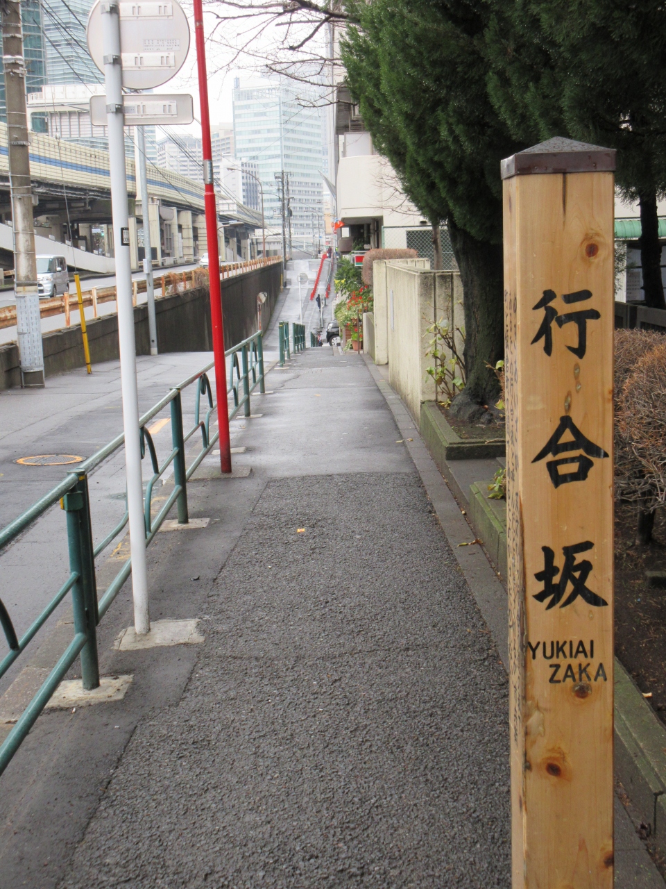 飯倉片町交差点から六本木1丁目駅にかけて、麻布通りと並行している300mほどの、U字型をした坂道です。道の両側にはレストランが二軒とマンションが建っています。人が行き合うことから名付けられたのではないかと考えられているそうですが、はっきりしないようです。U字型である以外、特徴がない普通の坂道です。