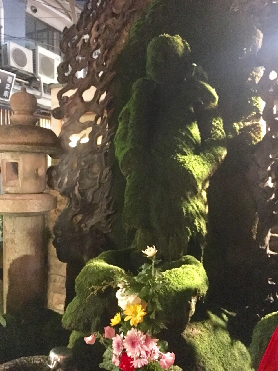 参拝する方々が水をかけていたので苔で覆われて緑色でした。