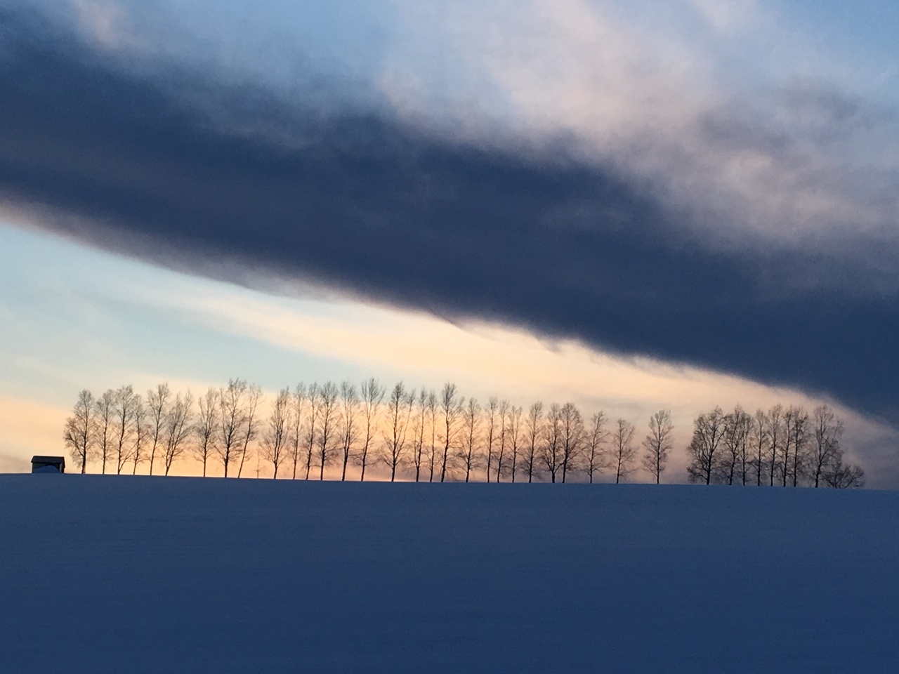 雪の中にたたずむように並ぶ木々の風景は、冬の北海道のイメージそのものです。ちょうど夕陽が落ちる時間帯で、赤く染まる空とのコラボが絵のようでした。夕方の時間帯を狙うのもオススメですが、冬季は道路も滑りやすいです。