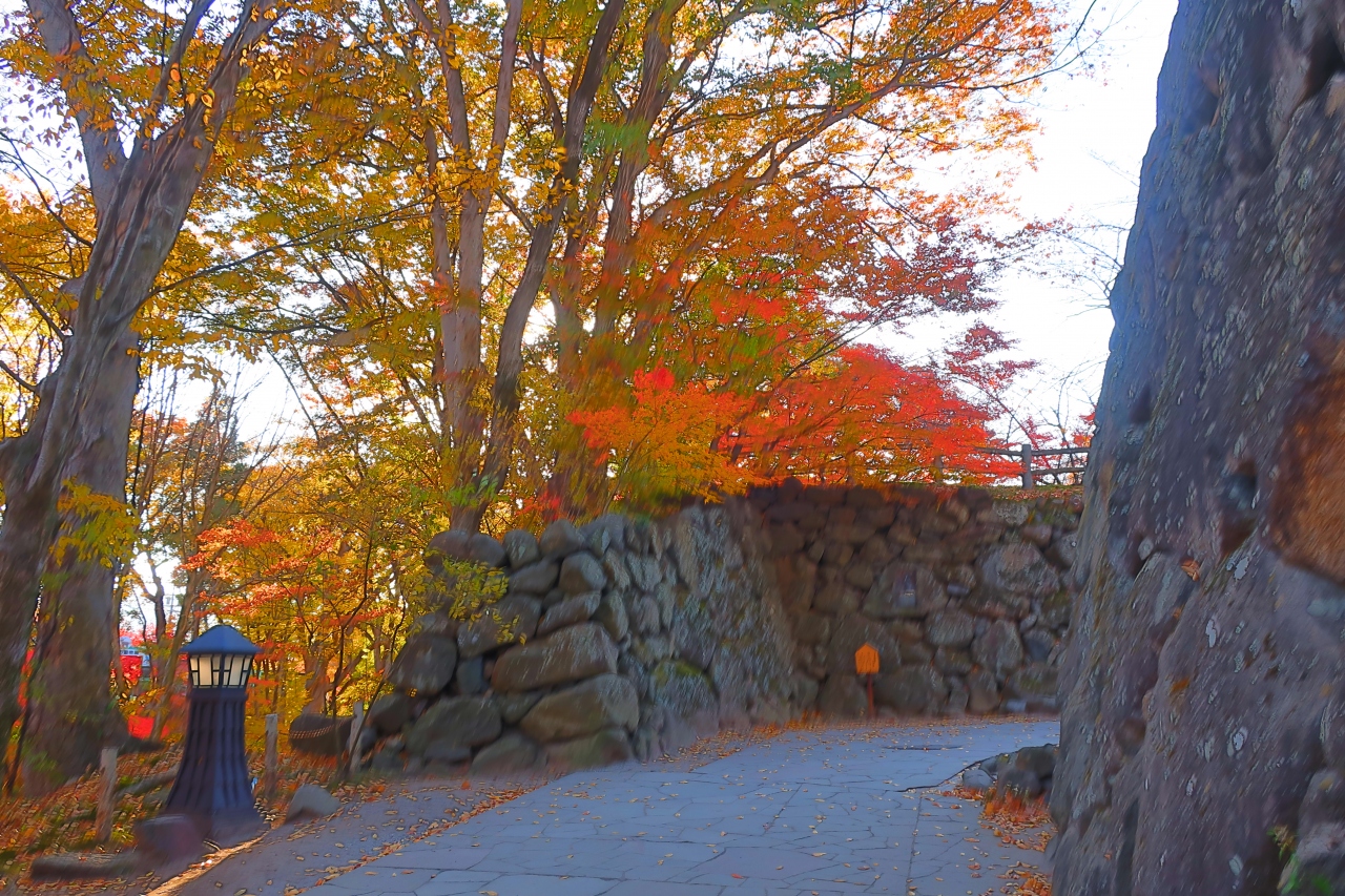 小諸懐古園の紅葉祭りの後半11月10日に懐古園に行きました。入城口を入って、先ず動物園と北の丸、二の丸の間の谷の紅葉が目に入ります。二の丸の門跡の枡形辺りは石垣の上を覆う紅葉が綺麗です。そして、圧巻の紅葉が見られるのは紅葉ヶ丘。地面に落ちた散紅葉で紅葉ヶ丘全体が真っ赤に染まります。