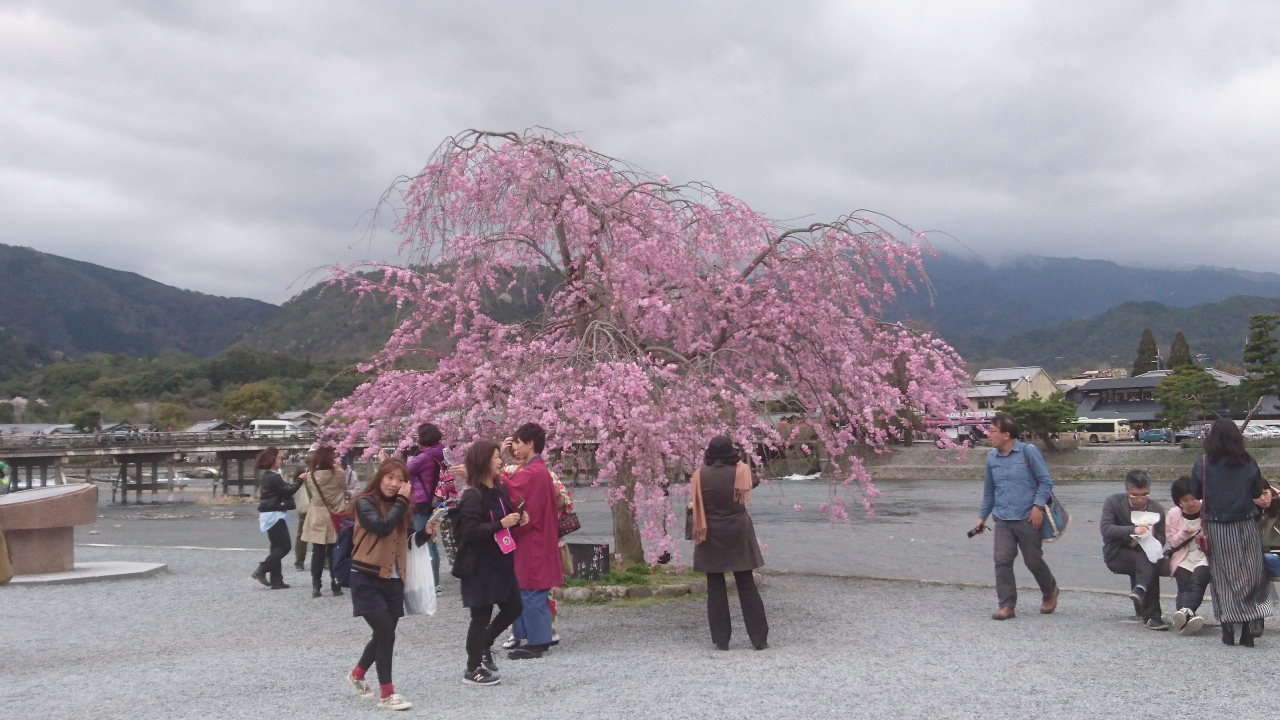嵐山の桜を見に行こうと嵐山公園の中ノ島地区に行きました。この日行ったときは日曜日だったので、多くの観光客がいましたが、満開の桜が見事に咲き誇っていました。満開の桜はソメイヨシノだけでなく、枝垂れ桜もあったので、2種類の満開の桜が楽しめて印象に残りました。