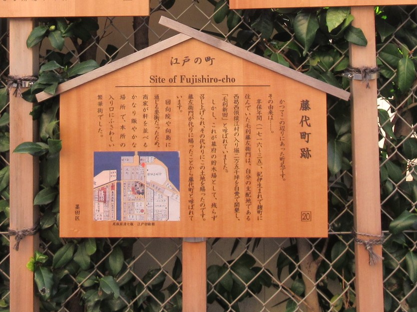両国橋の東側、両国側に渡ってすぐ南側に高札が建てられていて、そのうちの一枚に藤代町の謂われを示すものがありました。なんでも江戸時代に毛利「藤」左衛門が、召し上げられた所領の代わりに賜った土地であるかことから藤代町と言われるようになったとか。当時の粋な洒落だったのかもしれません。そんなことを考えてにやつきながら見学しました。
