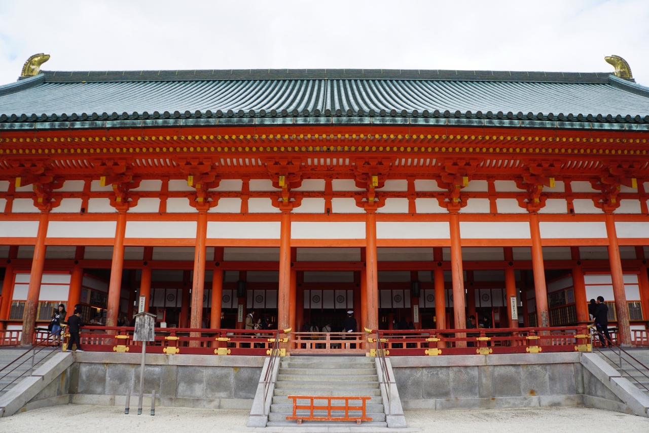 平安神宮の大極殿は、神社としては拝殿に当たる建物だと思いますが、前には右近の橘 左近の桜もあるし、その印象は御所の紫宸殿みたいです。ただ、こちらの配色も赤に緑で統一されていて、どこまでも華やか。屋根に乗ったしびも威厳をたたえています。