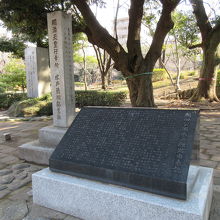 スカイツリー側に位置する隅田公園の中に碑が建っています。江戸時代、徳川御三家の一つ、水戸藩下屋敷があった場所で、今は石柱と由来記が書かれた碑が残っています。隅田公園内には、下屋敷の名残と思われる日本庭園があります。池の周囲に造られた雪吊り、池面に映る木々、不老不死を願う石組みなど当時の姿を垣間見ることができます。花見に訪れた際は、下屋敷ゆかりの日本庭園もぜひ観賞してほしいと思います。