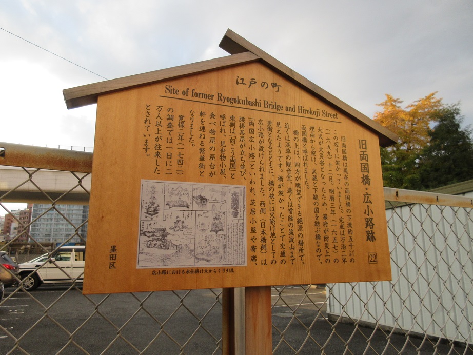 昔の両国橋は現在の近代的な両国橋の下流約50メートルの場所にかかっていたようで、交通の要衝ということもあり広小路が設けられていました。今の両国橋を渡ると京葉道路伸びていますが、当時はより南側が中心であったわけで、そう考えると吉良邸に討ち入りした赤穂義士らが泉岳寺に向かって意気揚々と引き上げて来たのも京葉道路ではなくもっと南の道だったのだろうと、高札を読んでそうしたことを想像することが出来ました。街歩きのだいご味ですね。